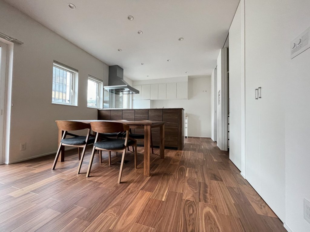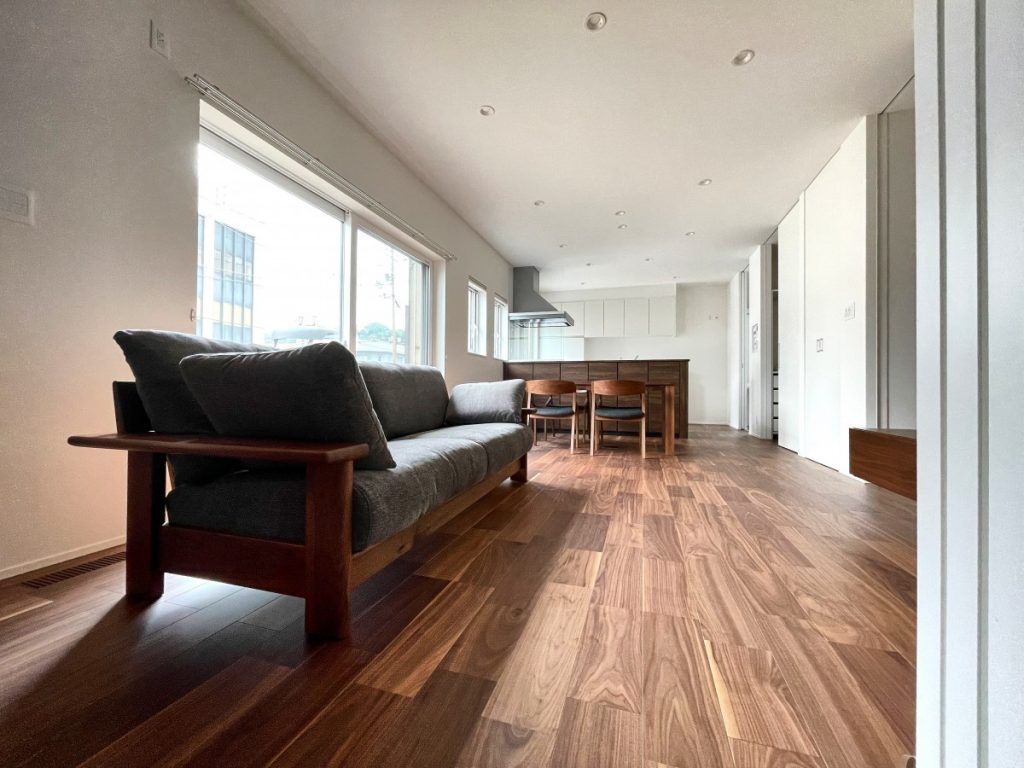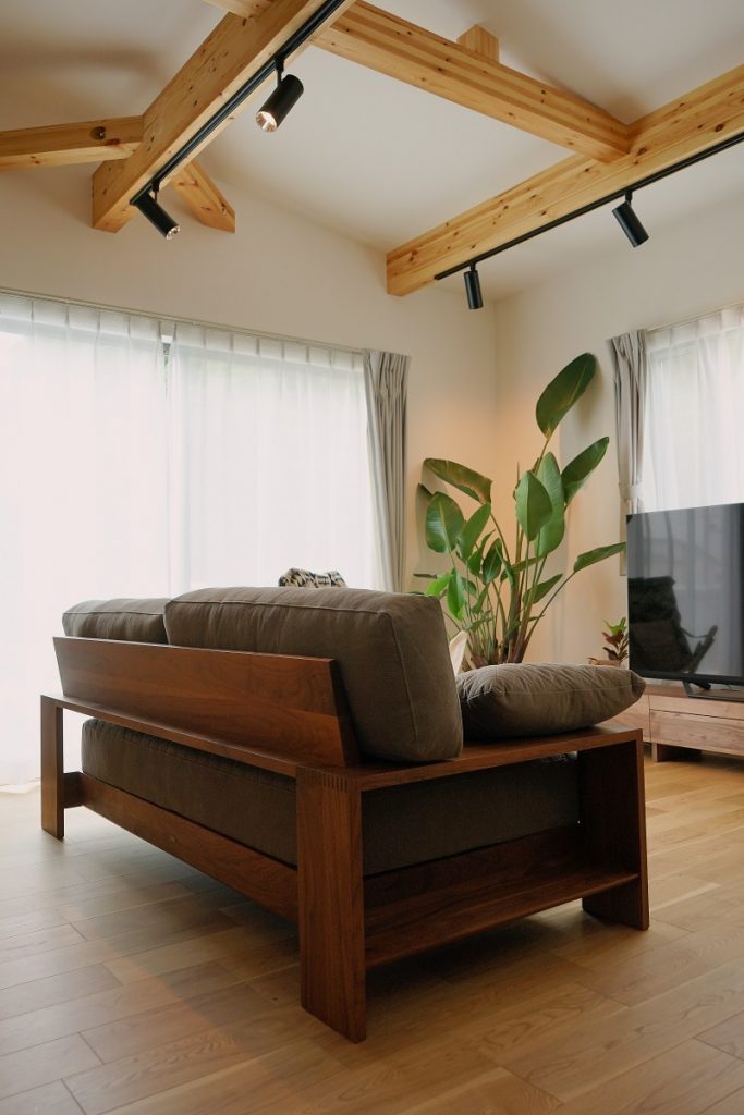 床と梁が明るい材種に対し、家具はウォールナットにして引き締め効果。