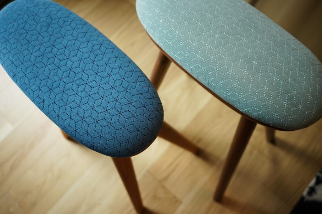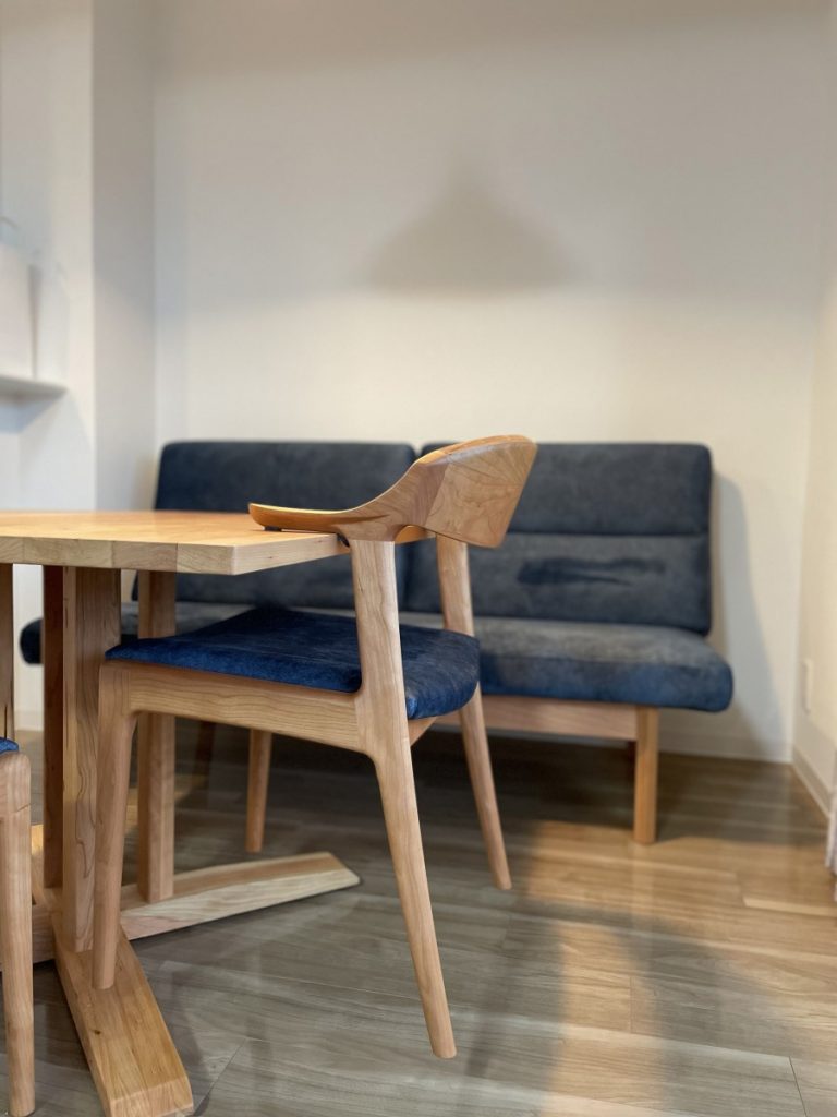 こちらの樹種はウォールナットとチェリー、ファブリックもデザインは一緒ですがカラーを変えるこだわり。