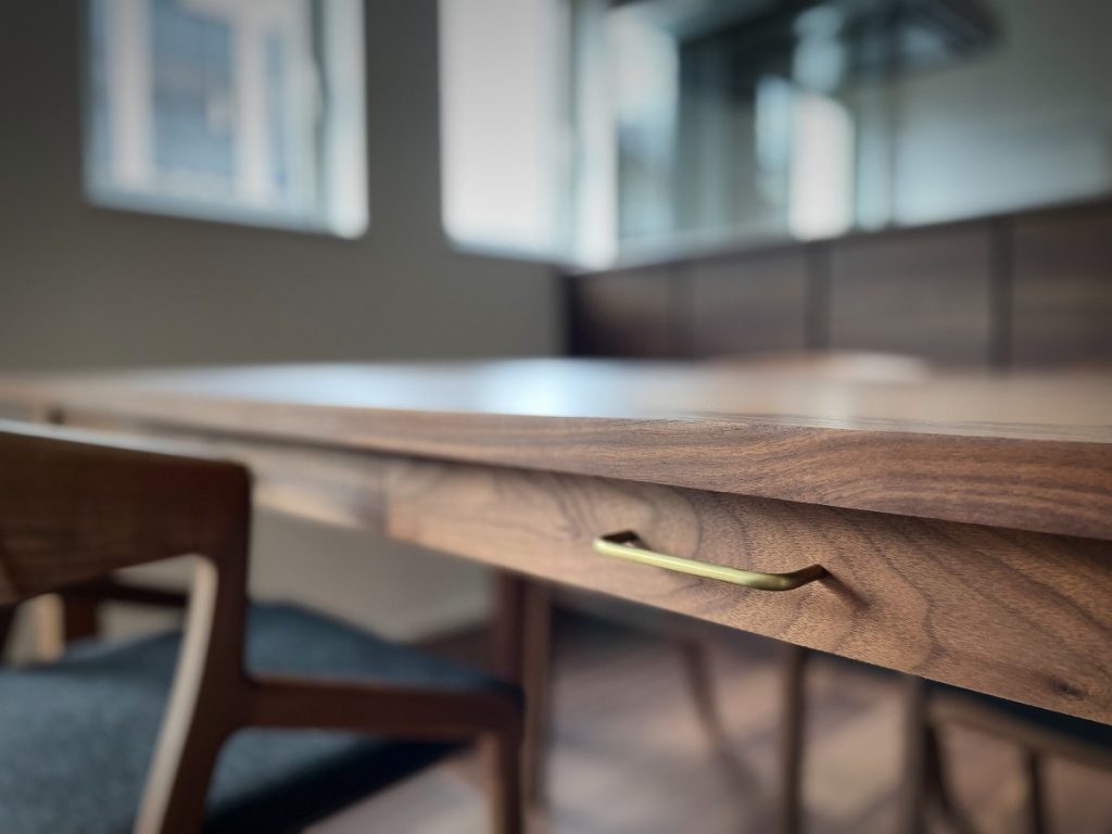 そして、引き出しが付いたダイニングテーブルはここもSOLIDのコンセプトの一つでもあります「異素材の組み合わせ」で、ウォールナット(木)に引き出しの取っ手を真鍮にし、異素材の組み合わせをカッコよくまとめております。