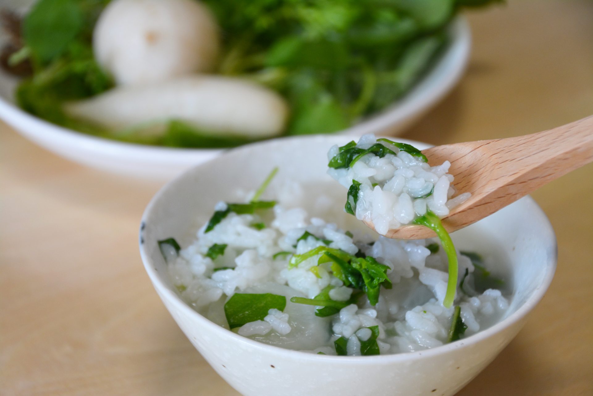 元日から7日目という事で、胃を労わり体に優しい七草粥を食し、一年の無病息災を願う。