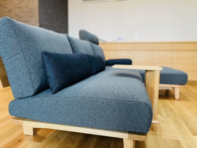 オプションのアームクッションと腰クッションはデニムで統一しており、ソファの全体としてちょっとしたアクセントになっています。