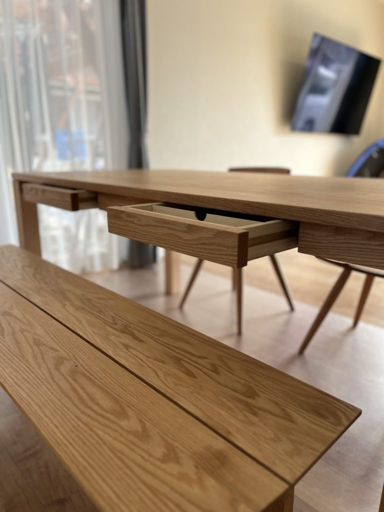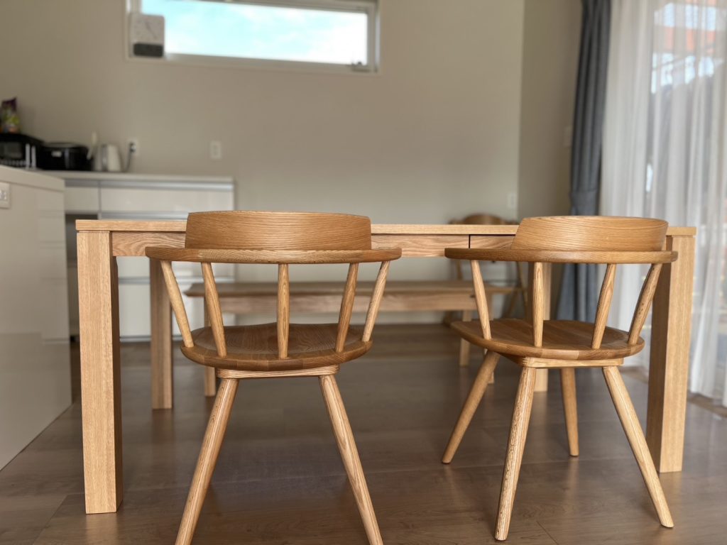 座る際の出入りも、椅子を引く動作が最小限ですみますし、ベンチも椅子も総無垢材なので