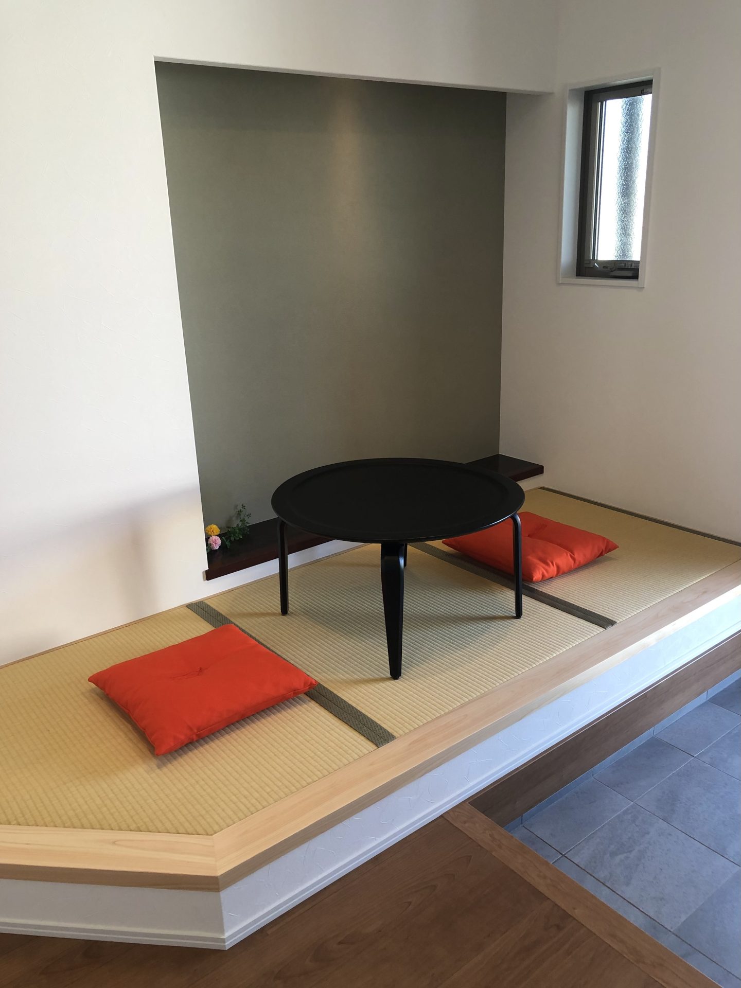 玄関先にお客様とお話しできる畳の間があり、斬新かつおしゃれな空間作りには