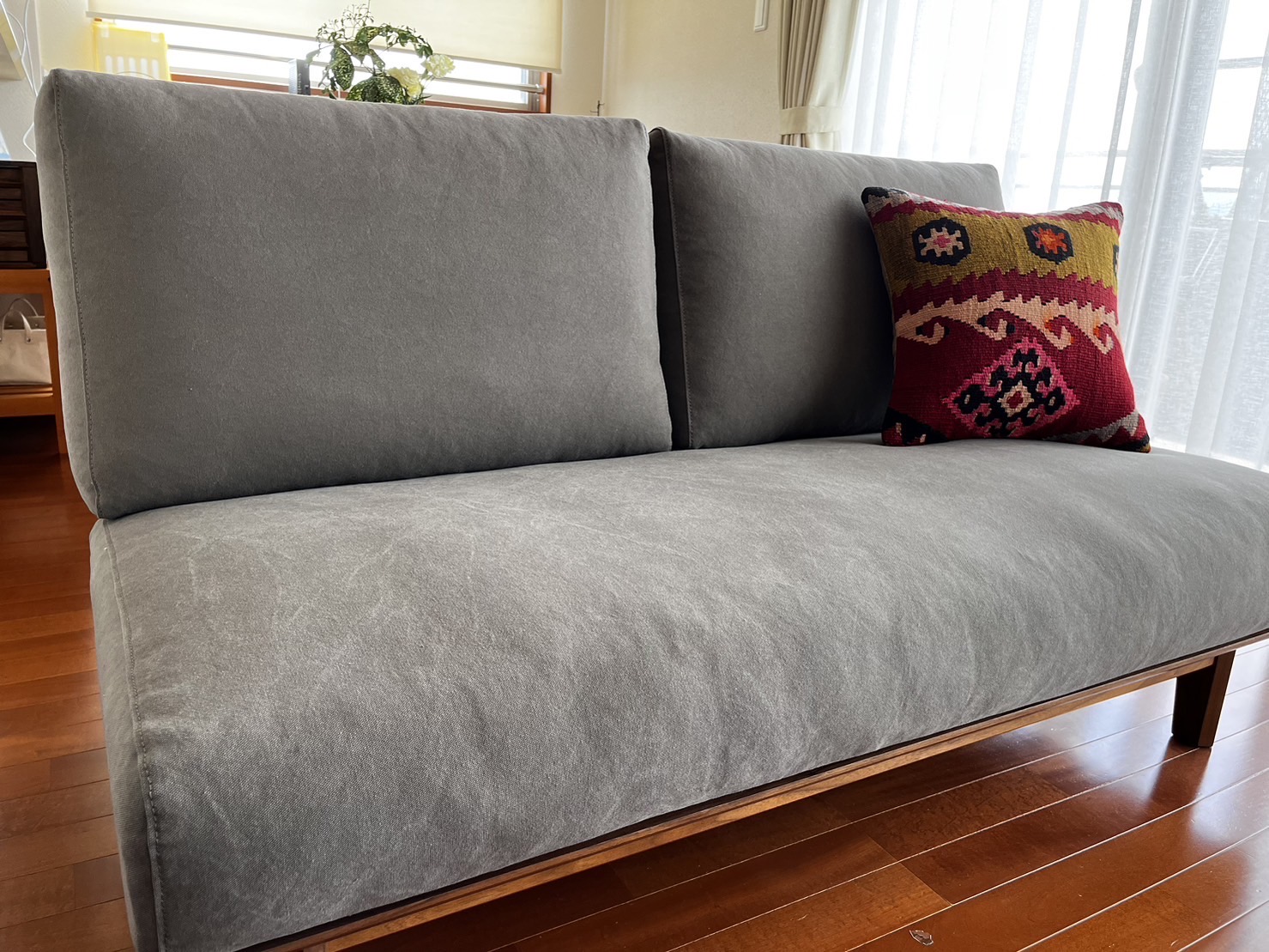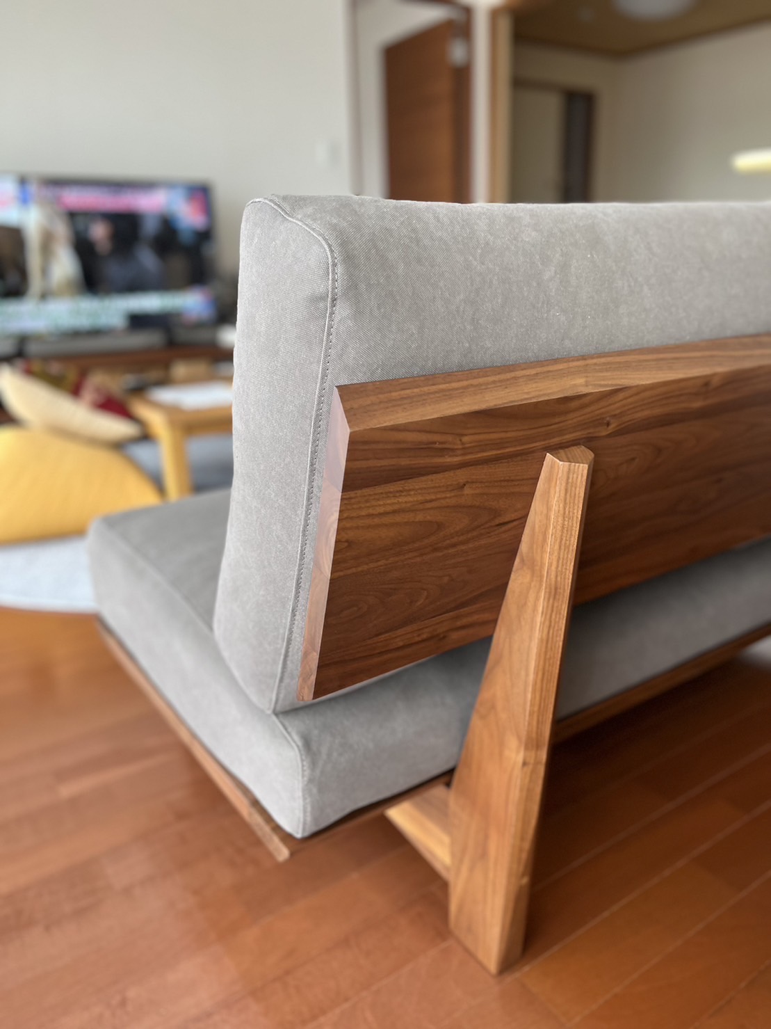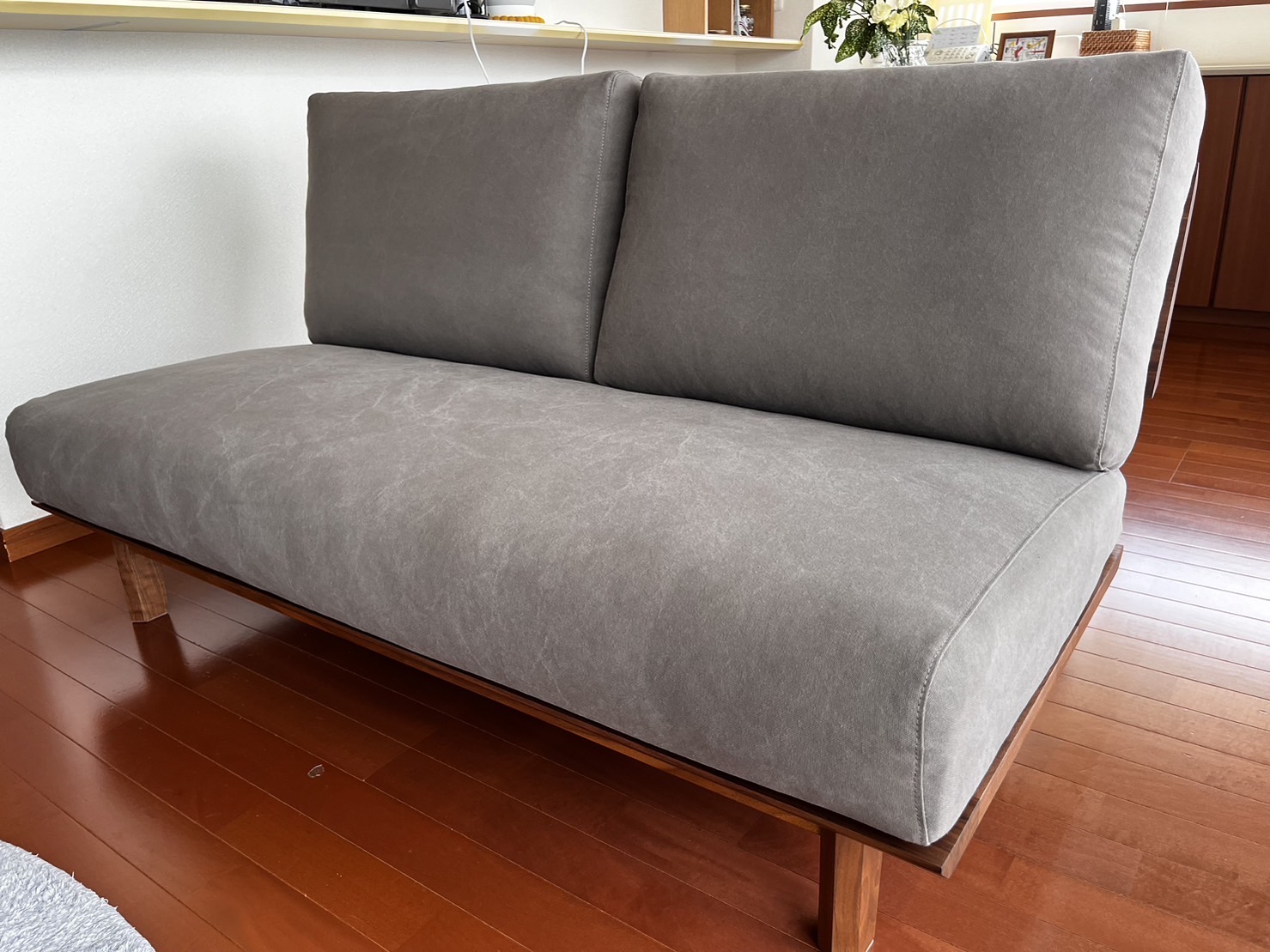 ウォールナット無垢材のフレームに、大人色のグレー帆布生地をお選びいただきました。