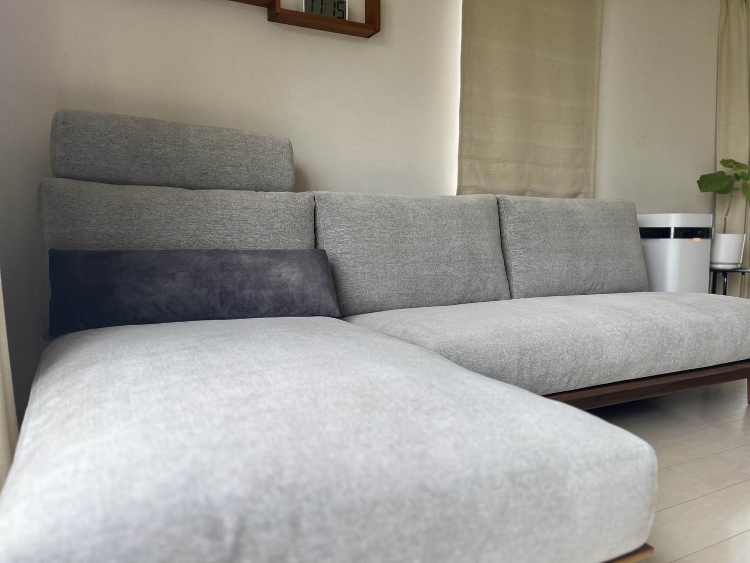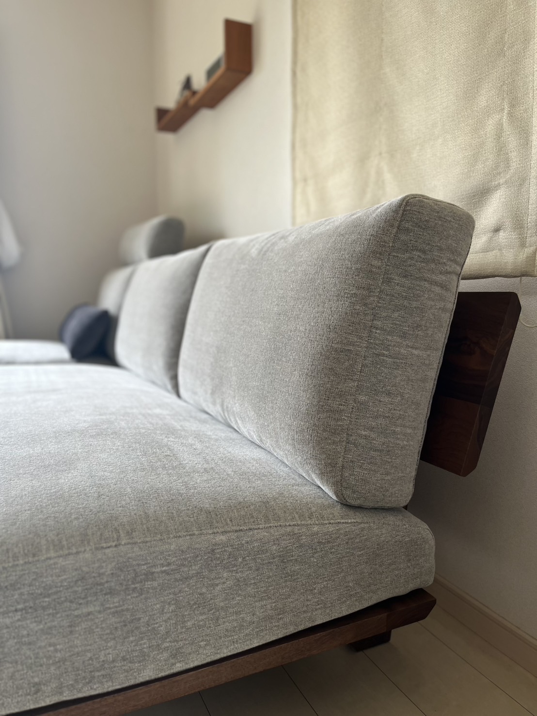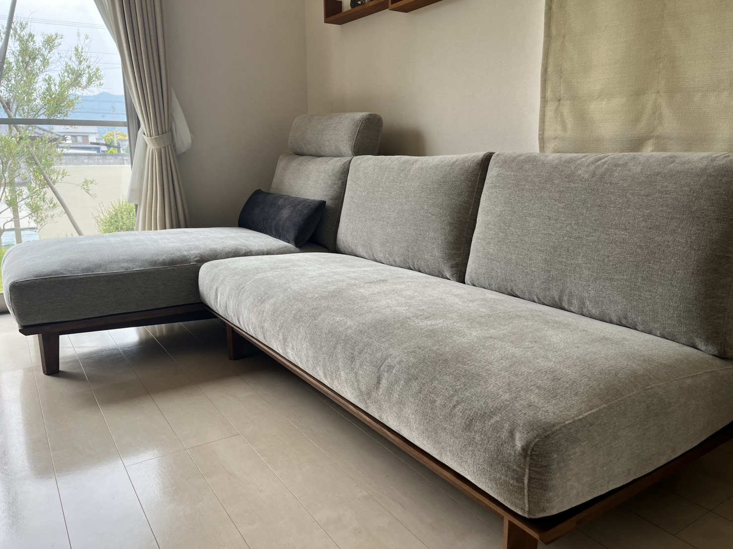 ウォールナット無垢材のフレームにグレーの張生地をお選びいただきました。