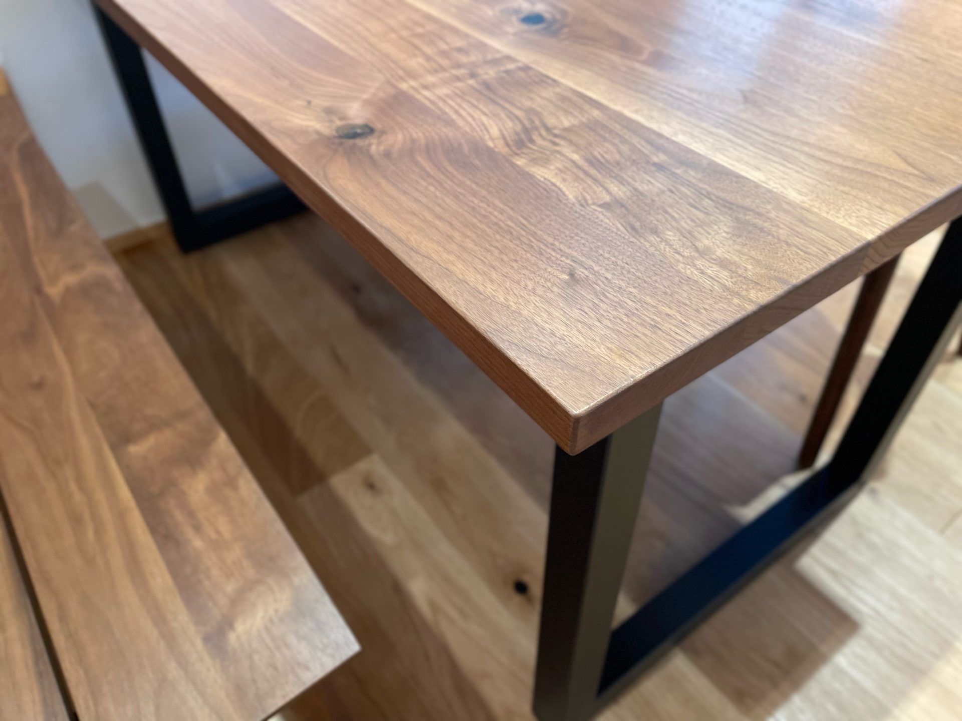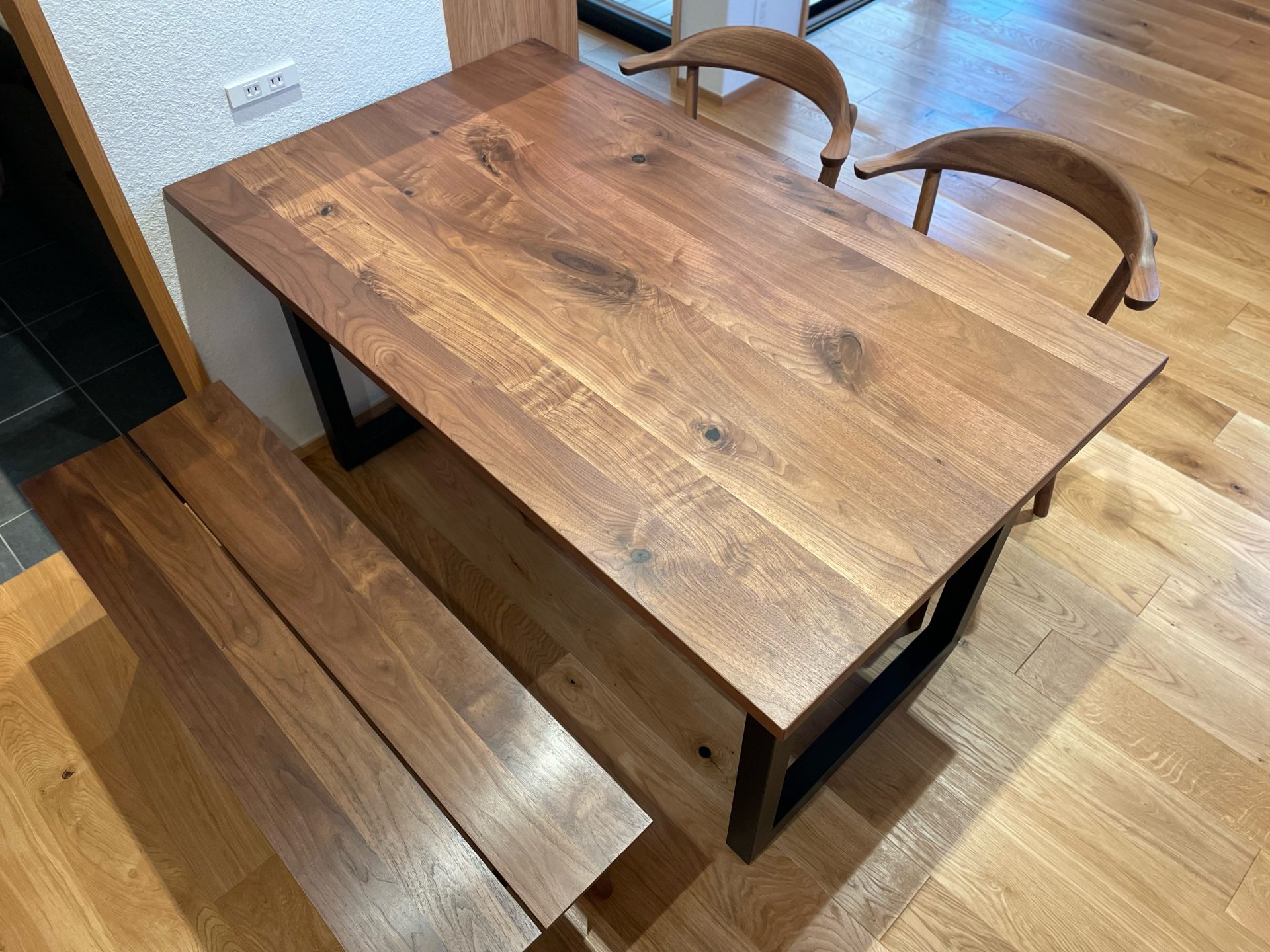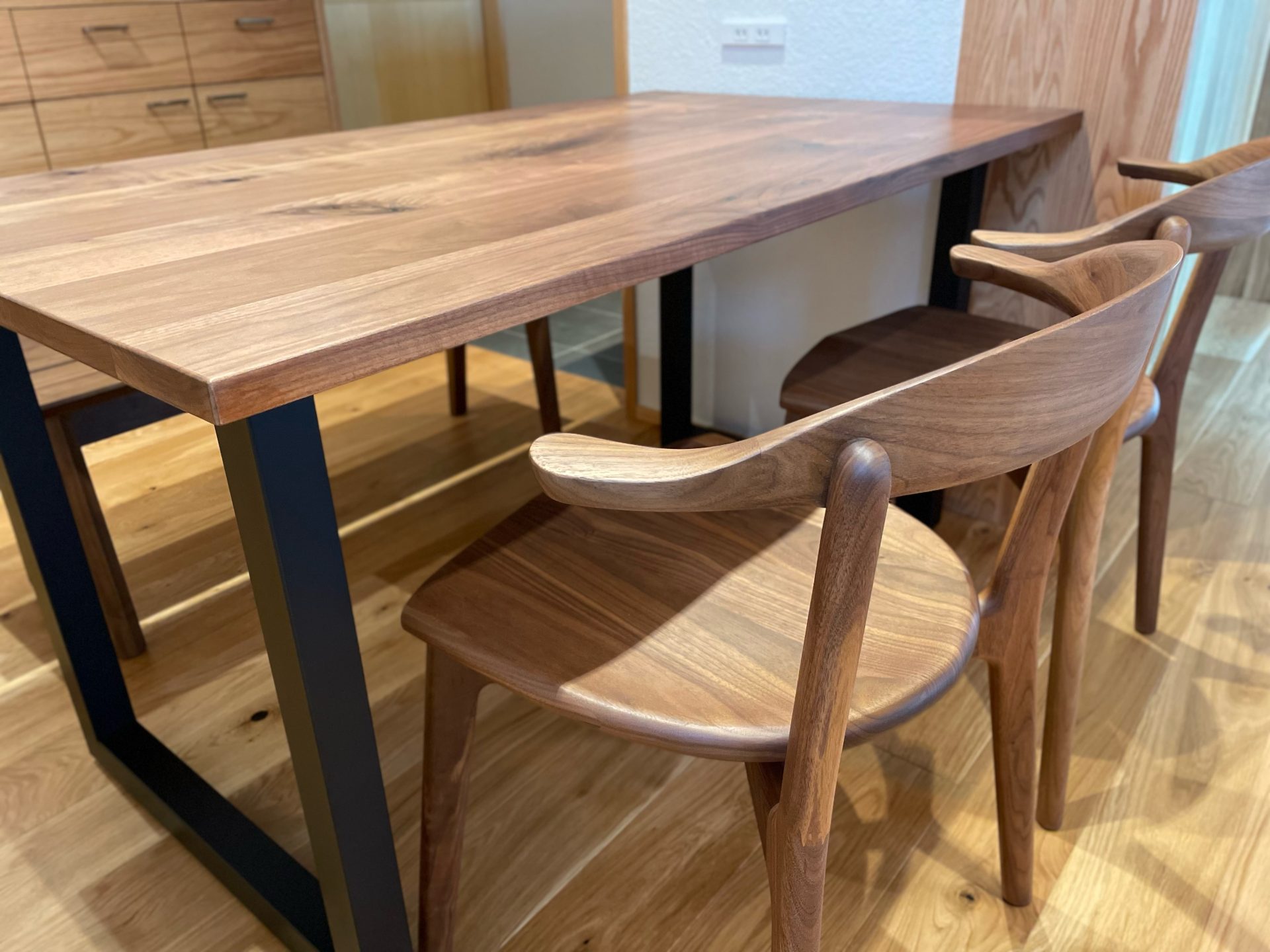 テーブルは、ウォールナット無垢材の流れるような木目と節がポイントの天板。