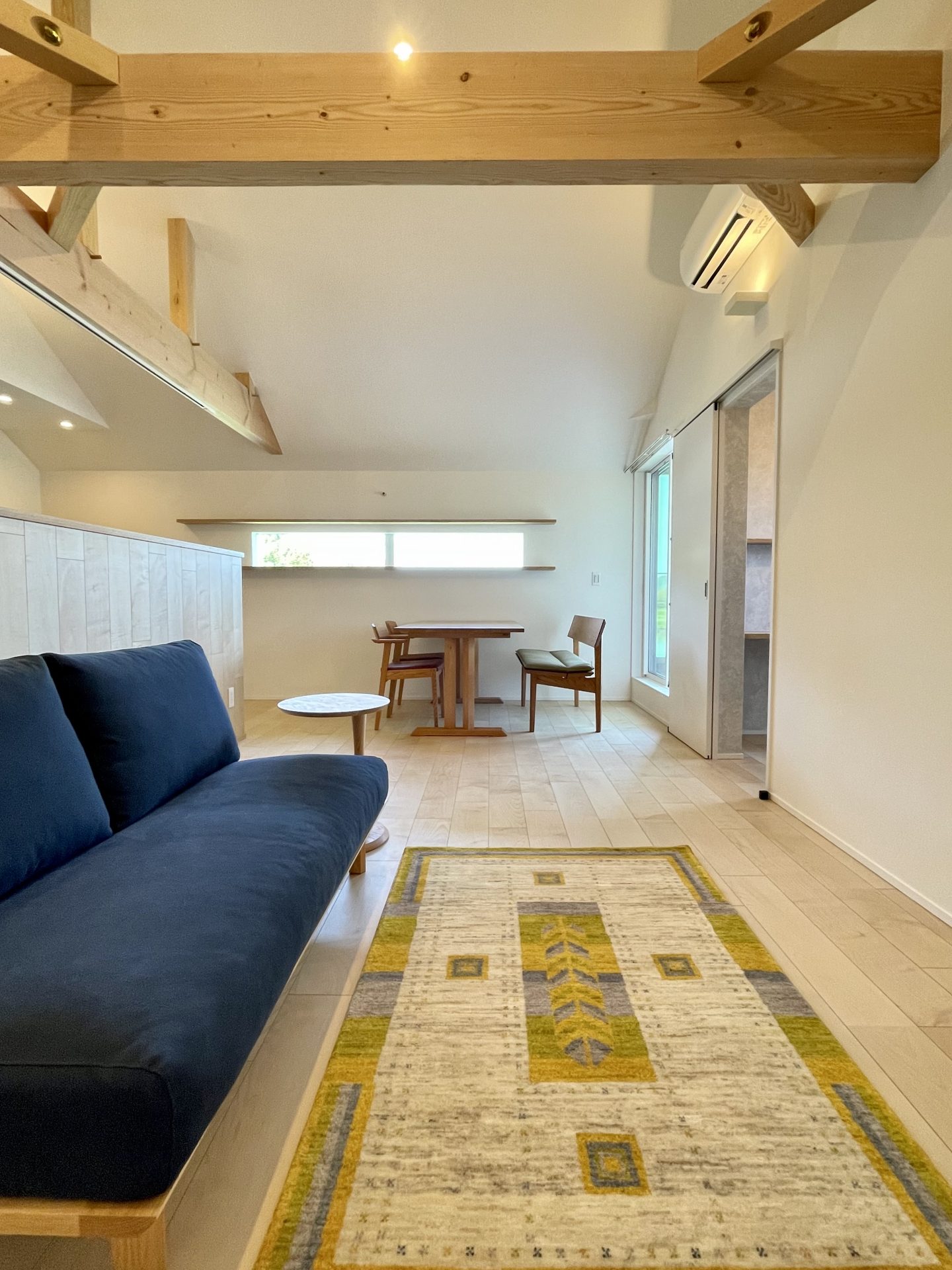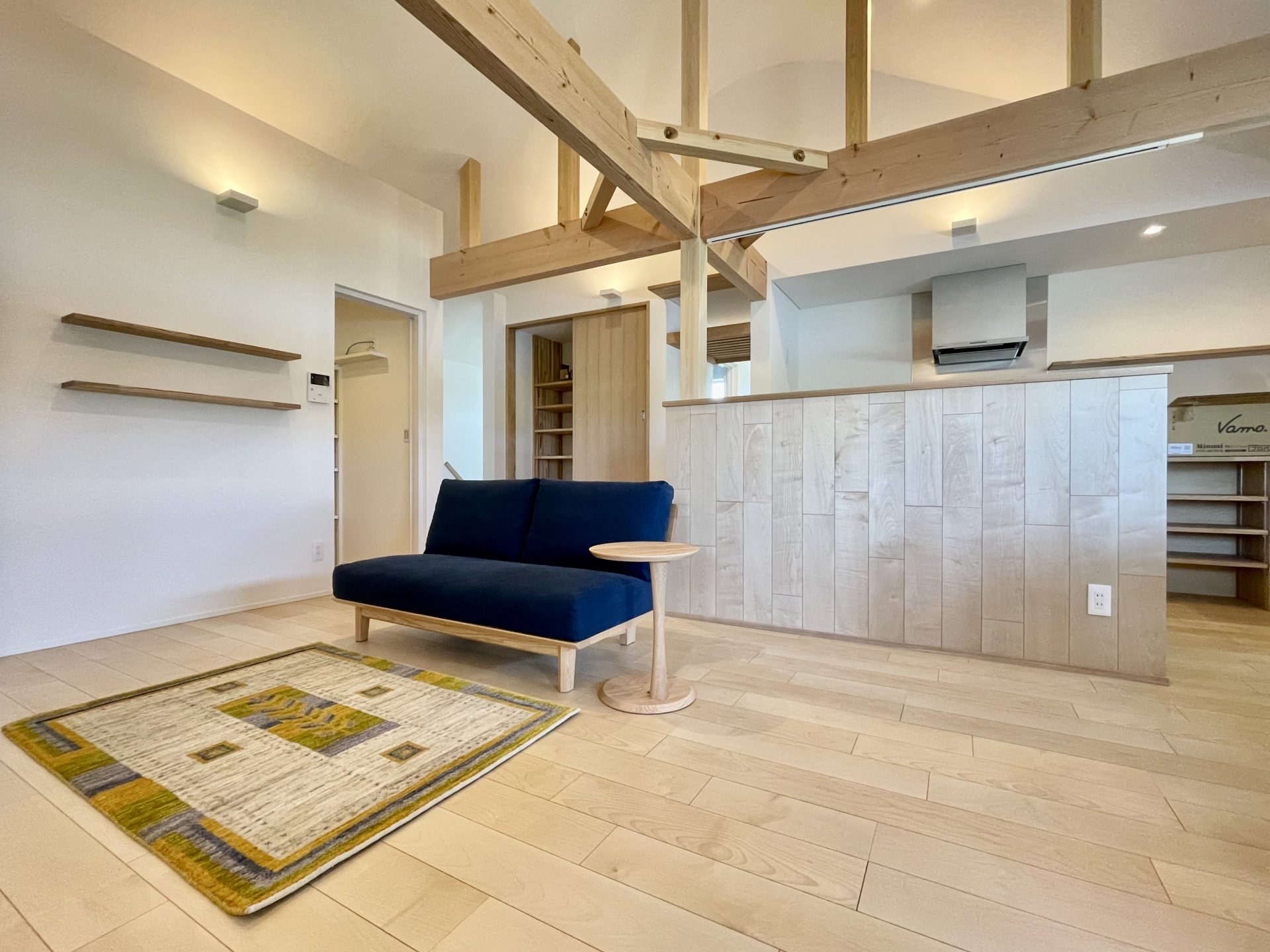 階段を上がると、広々とした空間に大きな梁が特徴的な柔らかい印象のLDKが。